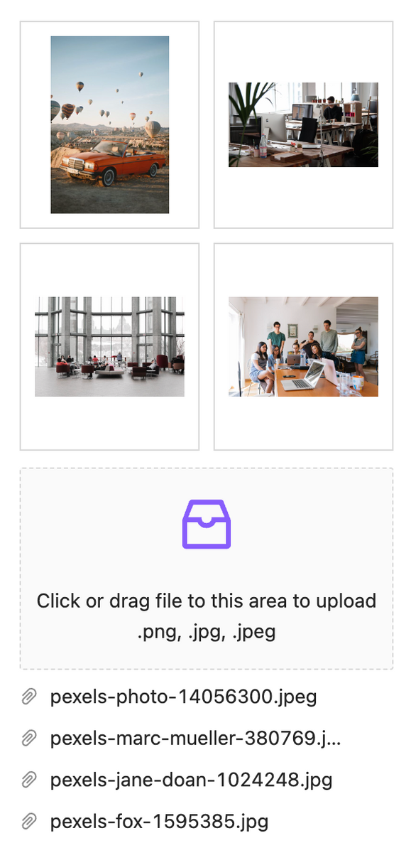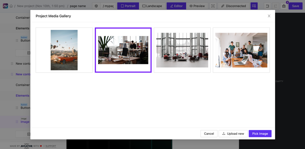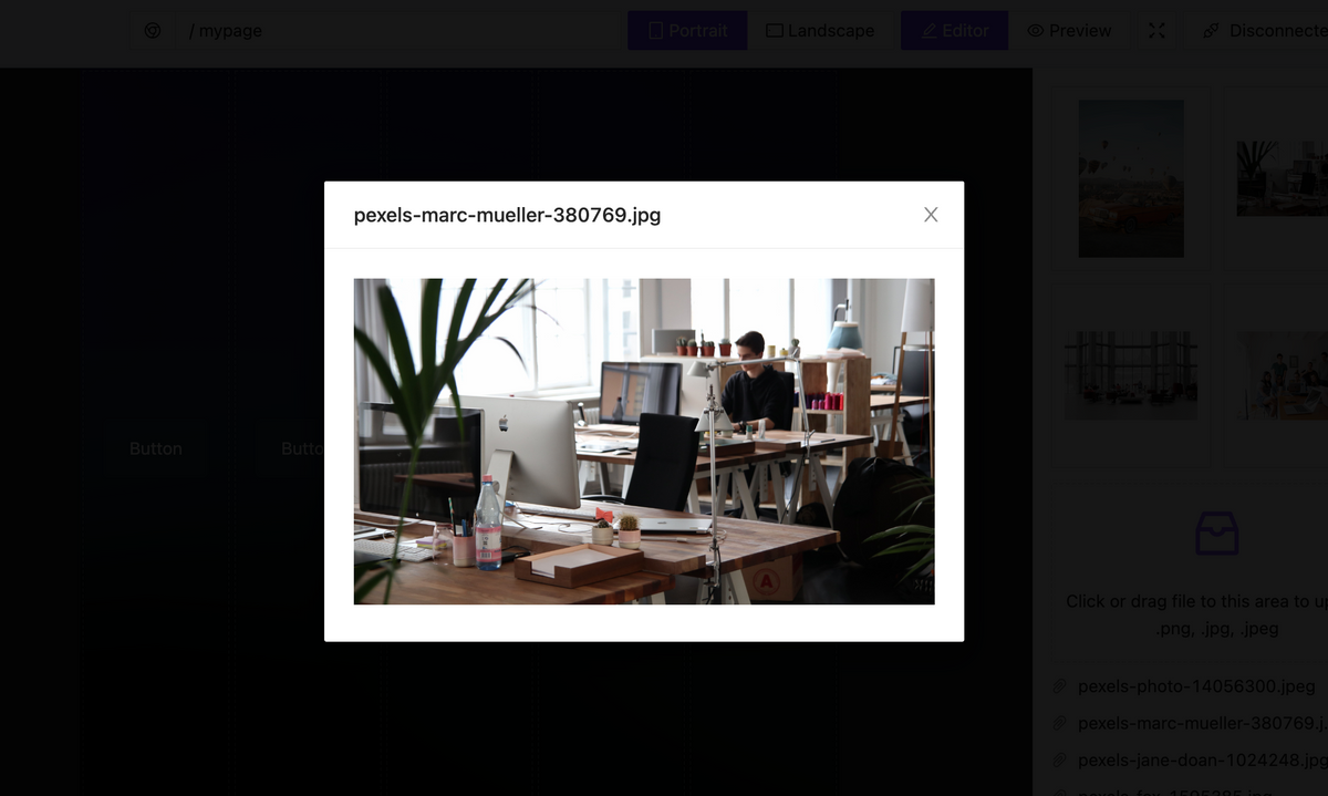 Upload your media file and use it as an Image element or background image. Now we allow file formats: .jpg, .png. New updates allow attaching more media formats: .svg, .webm, .mp3, .mp4, and more to create a video background, animated & interactive SVG objects, and other effects.